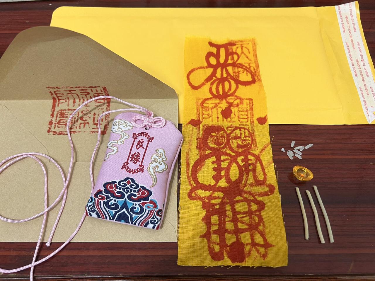 小符箓 均用朱砂绘制于黄布上,装锦囊锦囊内装拜斗用的斗米,元宝,三宝香,外面装信封,装防水泡沫快递包裹,交付拉满